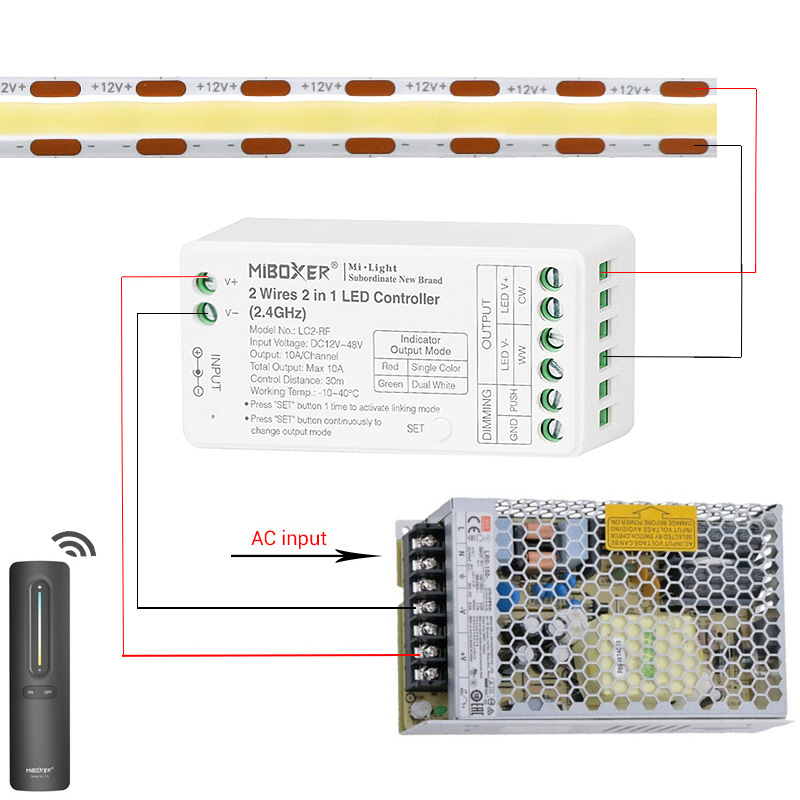 In addition, unlike the traditional 3-wire cob CCT control, this accent beam led lighting COB tape carries a 2-wire color temperature change, with no distinction between positive and negative poles, each wire represents a Kelvin color temperature. If you prefer to use a smart controller, you need to select a specific 2-wire CCT type to fade the light from 2700K warm white to 6500K white. Consider the LC2-RF and C3 wireless control combo in the kit with LRS-100 series AC to DC power supply (only for 5m length).