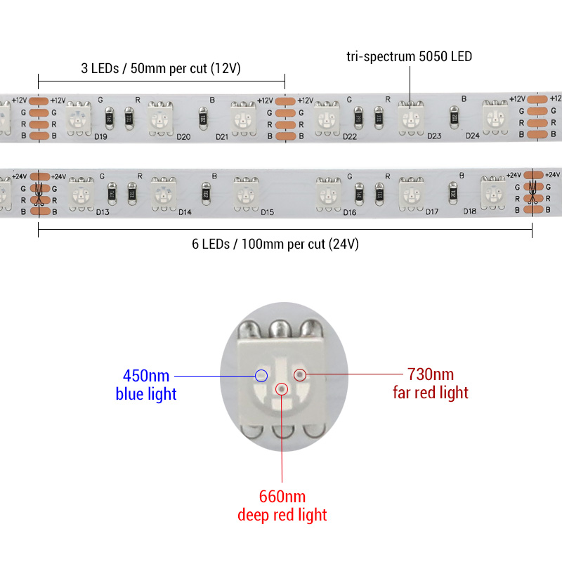 450nm + 660nm + 730nm Tri-Spectrum Tunable Red Blue LED Horticulture Grow Light Strip