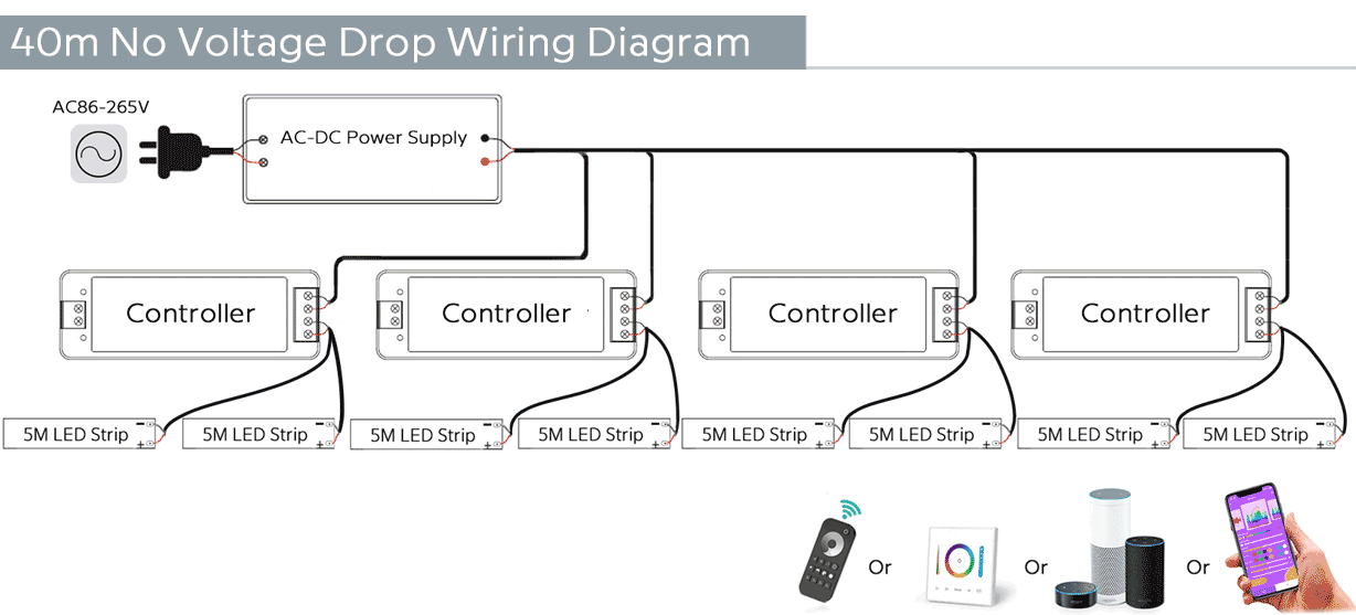 Can one dimmer control multiple single color led strips? Of course, an led dimmer can control two single color led lights like the below wiring diagram. It is worth noting that the power of the led light controller should be the same as the power of the led driver.