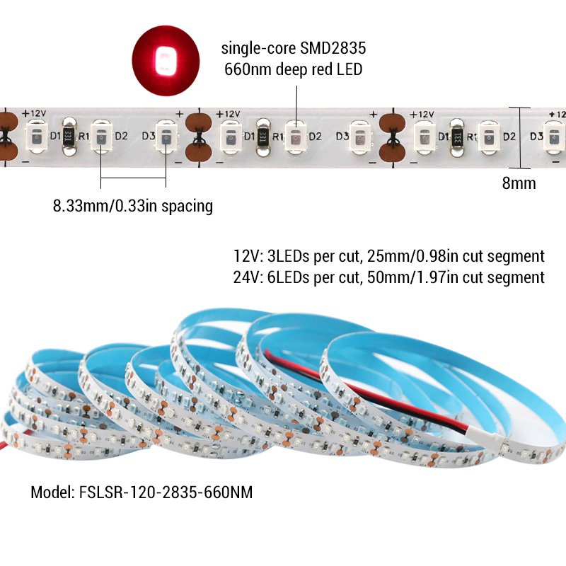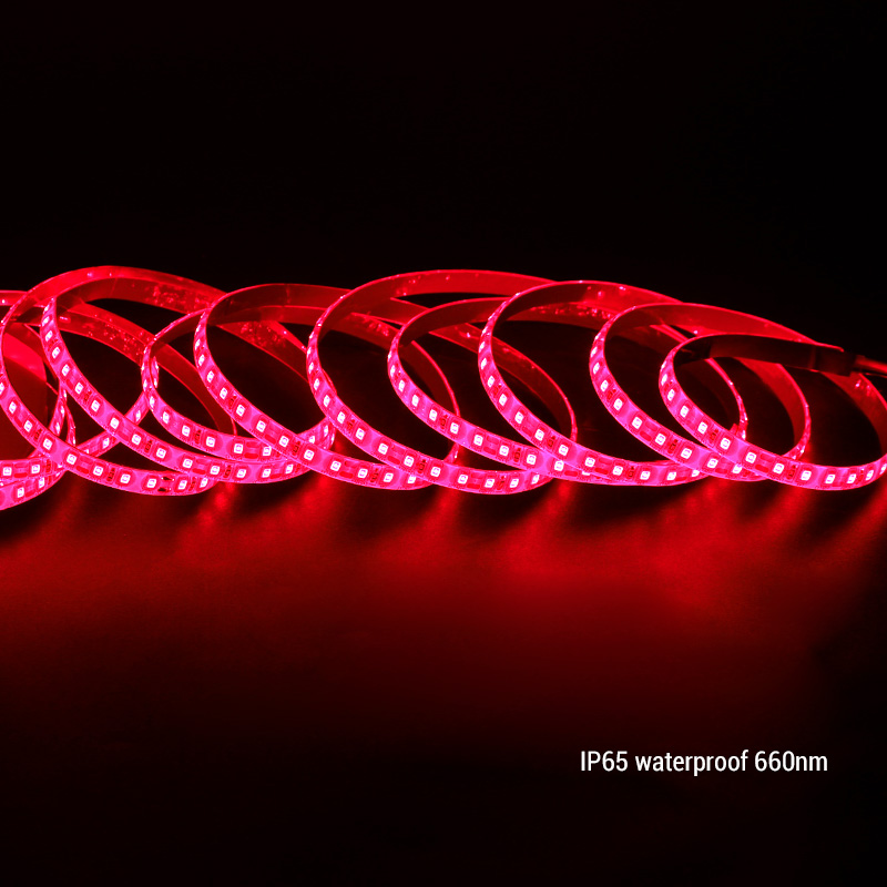 120 lights per meter high density fine pitch LED 660nm deep red light strip, using 2835 SMD chips as light source, emits 660 nm long-wave red light, its strong penetration and low energy is ideal for promoting plant flowering and fruiting, red light phototherapy to help cell regeneration and accelerate healing. The 8.33mm pitch of the 660nm LEDs provides a very uniform light effect. The 660nm led light strip is only 8mm wide and features a flexible circuit board that can be easily bent for curved surfaces and complex installations. Adhesive tape is applied on the back for easy fixing and installation.