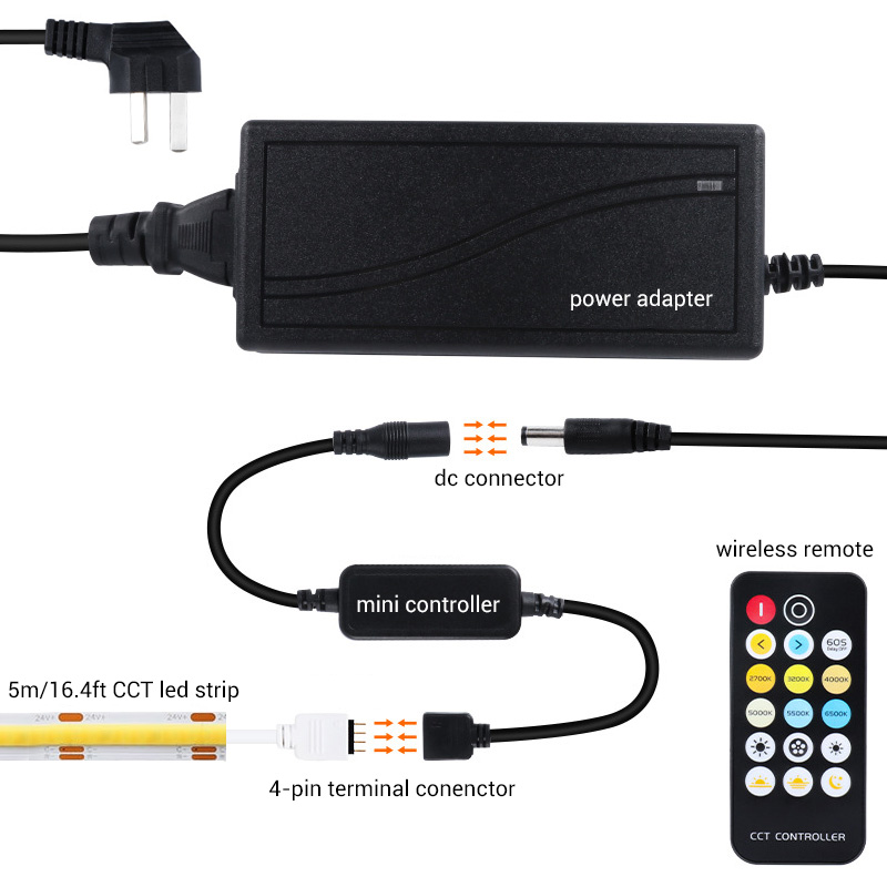 This plug-and-play dimmable tunable white COB LED strip kit includes a 5-meter strip light connected to a mini controller via a convenient 4-pin quick connector. The controller features a DC power input for direct connection to a household outlet using the included 24V/4A power adapter. The entire system comes with a handheld remote control, allowing you to easily adjust the COB strip light's brightness (0-100%), color temperature (2700K warn white to 6500K daylight), and other parameters. Even without professional LED wiring knowledge, you can quickly install and effortlessly use this lighting system.
